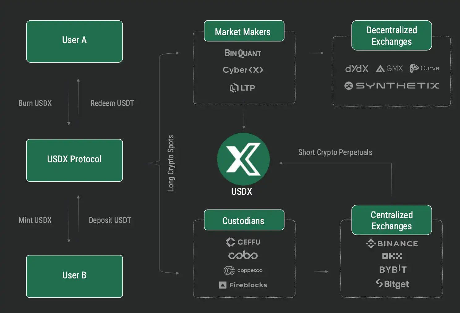 当完成第一步后,usdx.money 将用户的 USDT 存储在链上托管机构,确保资产安全,同时镜像至顶级交易所,用于后续的收益生成。与 USDX 合作的做市商和托管机构均为经过长时间市场验证的机构,如 Cobo、CyberX、Fireblocks、Ceffu 等。