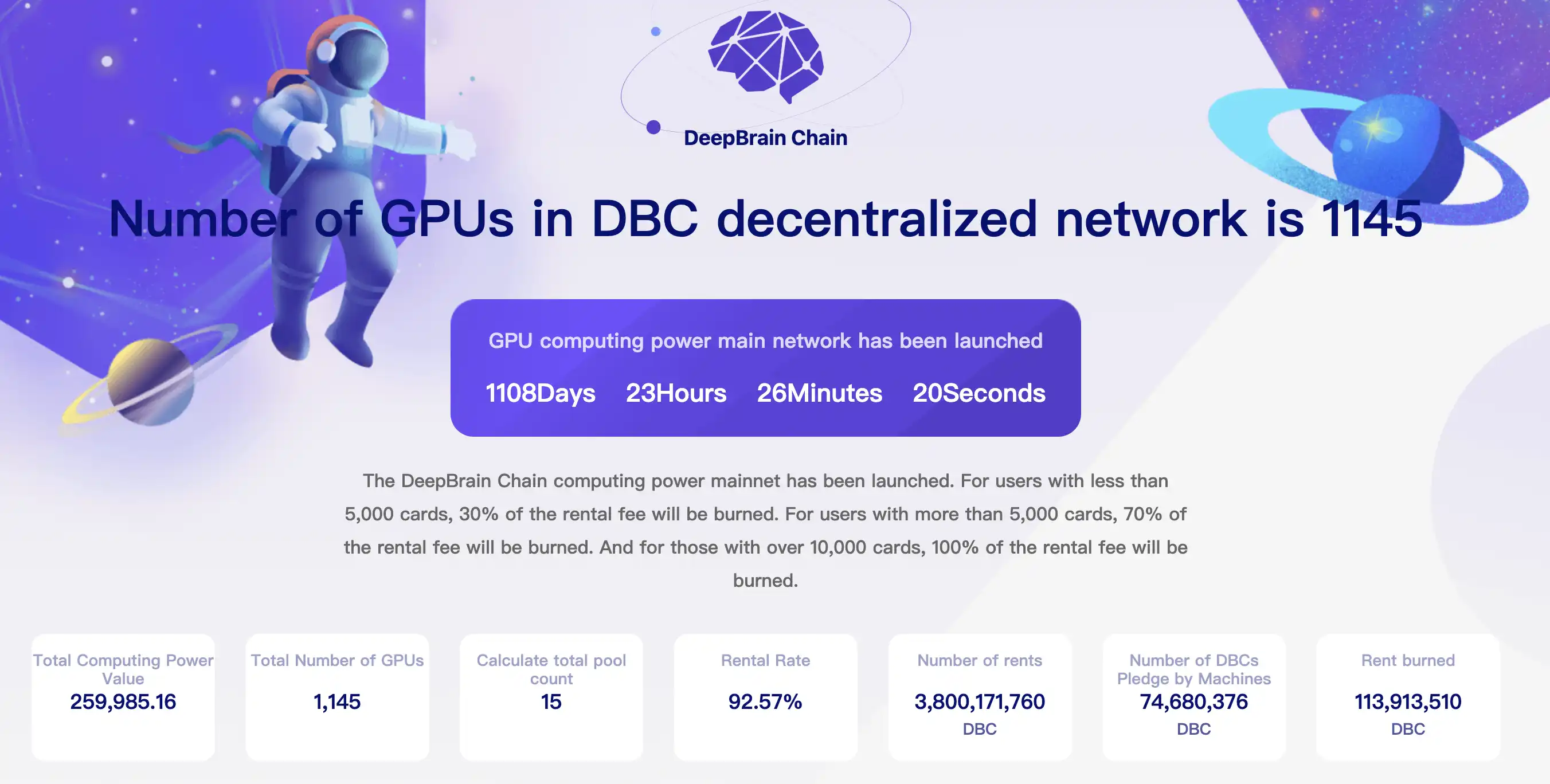 据官网信息,目前 DBC 总算力值达 259,985.16,拥有超过 1145 张 GPU,GPU 租赁率高达 92.58%,GPU 租赁已消耗超过 1.13 亿枚 DBC,充分展现了其资源的高效利用率。