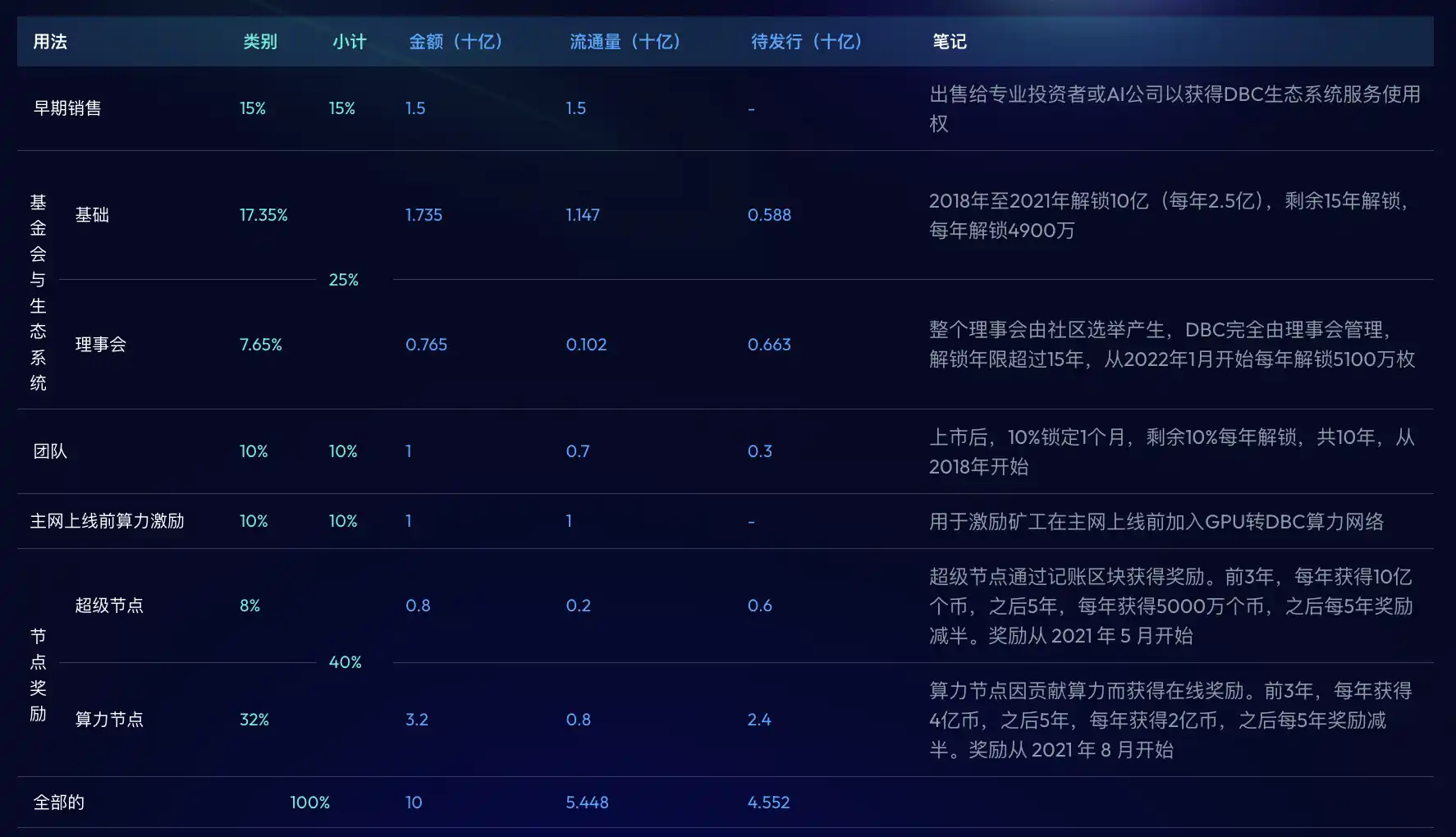 DBC(DeepBrainChain)代币总量为 100 亿枚,供应量固定,永不增发,预计将在约 100 年内完成全部发行。DBC 采用通缩模型,用户支付的租赁 GPU 费用会根据 GPU 总量的不同比例被销毁:当网络 GPU 总数在 5000 台以内时,销毁比例为 30%;超过 5000 台时,比例提升至 70%;达到或超过 10000 台时,销毁比例增至 100%。