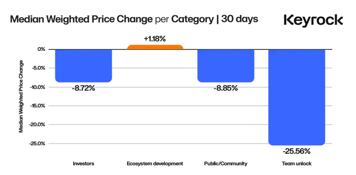 · 生态系统发展解锁的破坏性最小,而团队解锁则始终导致价格最大幅度的下跌