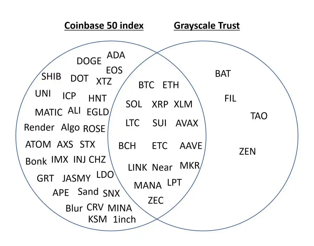 灰度围绕着市值前 20 的币种推出了一系列基金,例如 BTC、ETH SOL XRP AVAX SUI BCH LINK XLM LTC 等基金。也有一些赛道龙头的币种入围,比如 STX BAT ZEC MKR ZEN