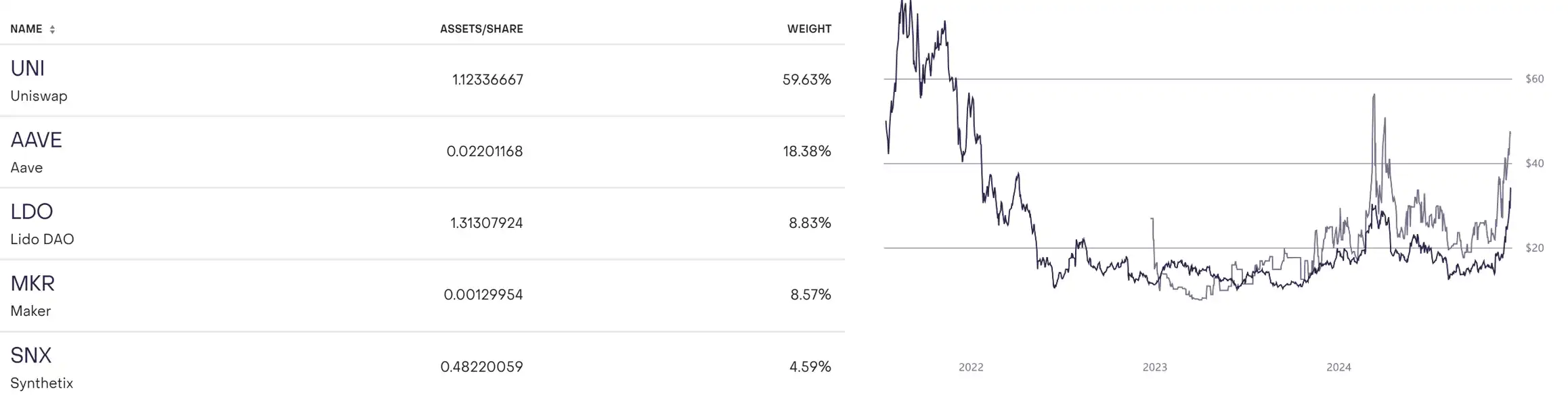Grayscale 去中心化金融 (DeFi) 基金是首批以证券形式单独投资于一篮子去中心化金融应用并从中获取价值的证券之一,其中包括了 UNI AAVE LDO MKR SNX 等标的。在近一个月表现良好,NAV per share(每股资产净值)从 13 美金飙升至 35 美金。目前管理资产规模为 800 万美金。