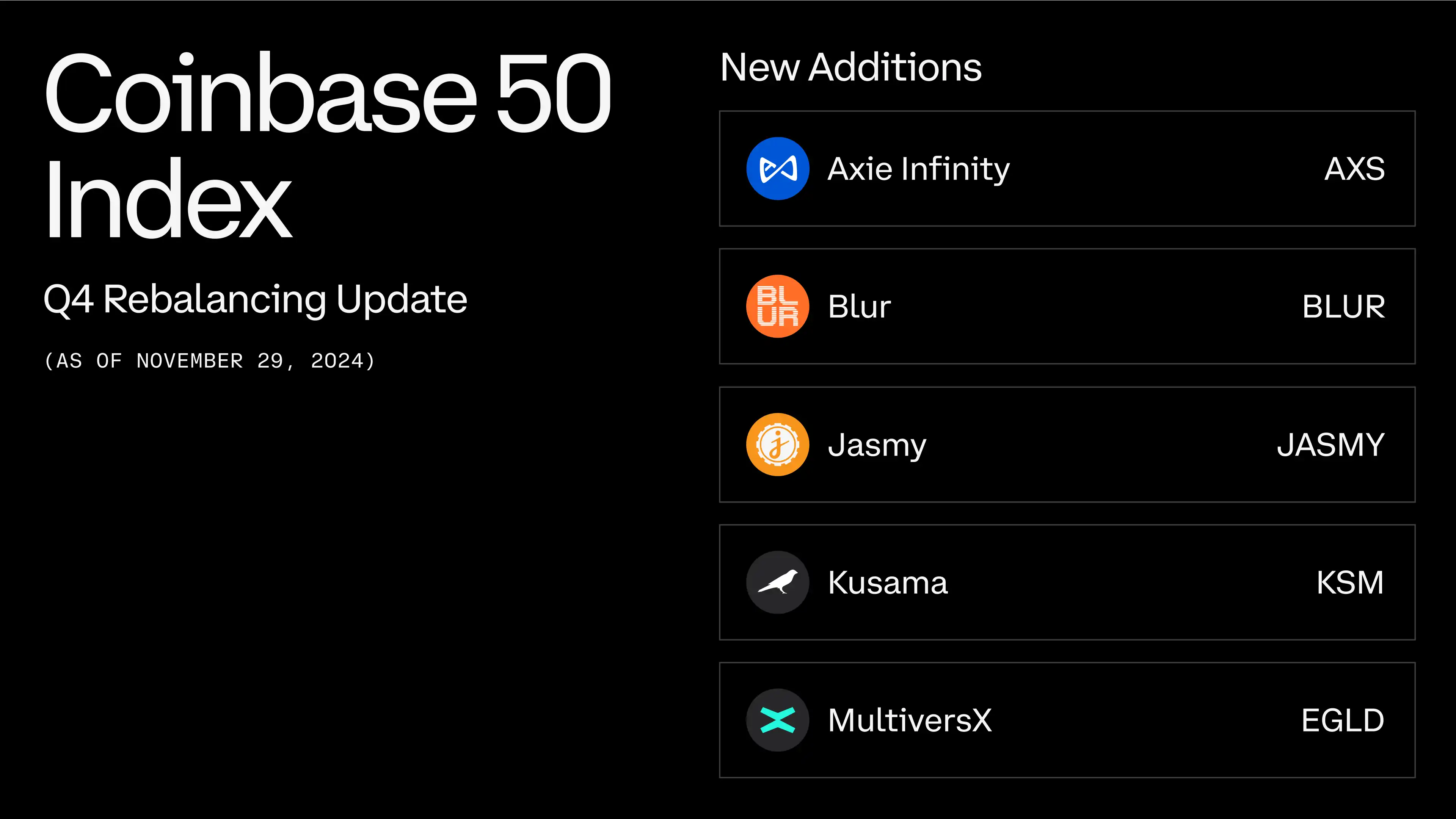值得注意的是 COIN50 指数并不是恒定不变的,每个季度会根据代币基本面进行评估从而增删。最近,代币 AXS BLUR、JASMY、KSM、EGLD 均被纳入了 COIN50 指数。