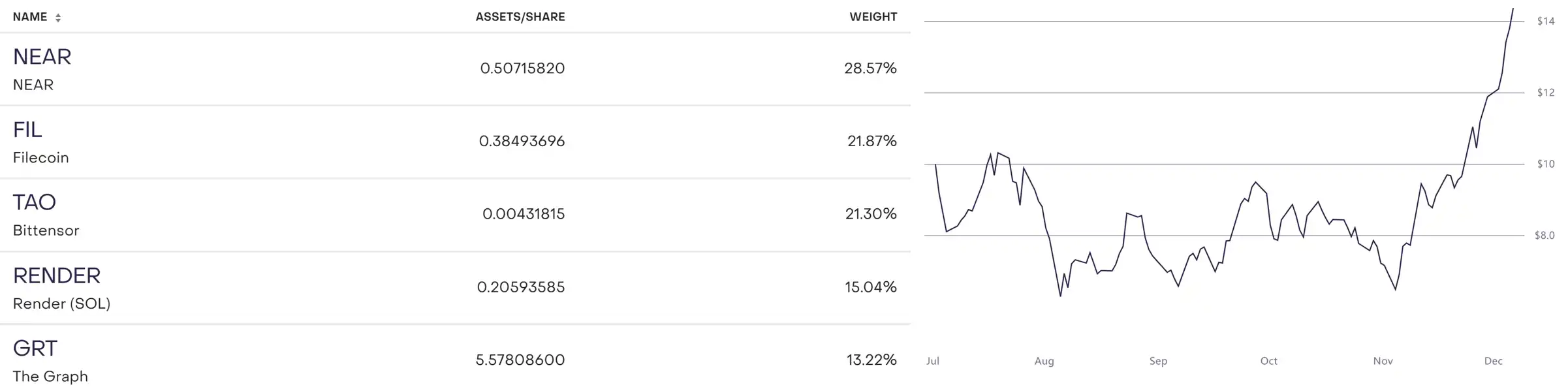 这一揽子去中心化 AI 基金中有 Near、Filecoin、Bittensor、Render、Graph 等 AI 标的。这些标的在这个月表现不俗,NAV per share(每股资产净值)从 6 美金飙升至 14 美金。目前管理资产规模为 220 万美金。
