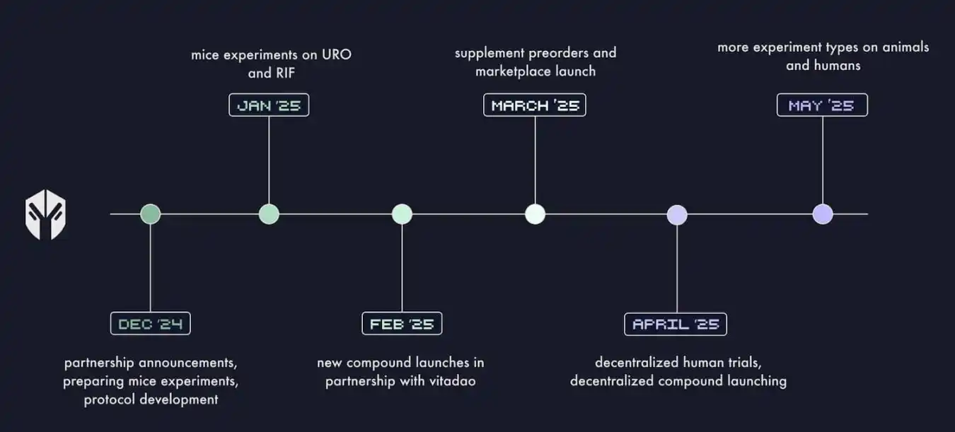 根据 pump.science 路线图,2025 年 1 月 25 日,将利用利福平 Rifampicin(RIF)和尿石素 A Urolithin A(URO)进行小鼠试验,2025 年 2 月 25 日与 VitaDAO 合作启动新的化合物,3 月 25 日开放补充剂预定和启动市场,4 月将进行人体试验。