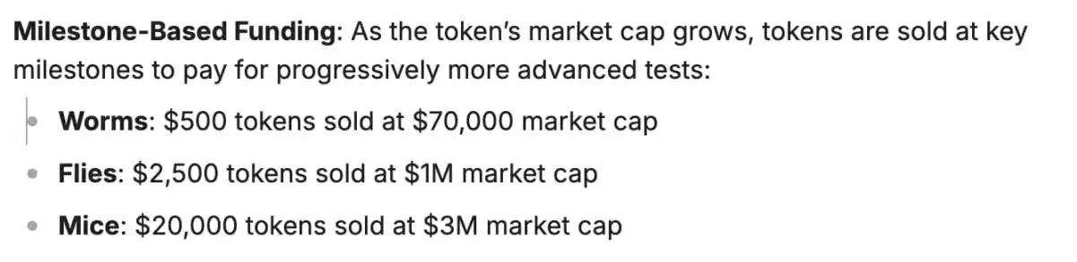当该方案在真实线虫上进行测试时,就可以观看实验数据流。数据定期传输给用户,供用户评估干预措施的价值。当然,更进一步,之后还会对果蝇、小鼠身上进行测试,收集更昂贵、更耗时但更与人类相关的数据。相关干预措施在获得许可后,可以作为补充剂或研究化学品出售。当然,随着代币市值的增长,代币会在关键里程碑处(7 万美元市值、100 万美元市值和 300 万美元市值时)出售,以支付逐步更高级的测试费用。