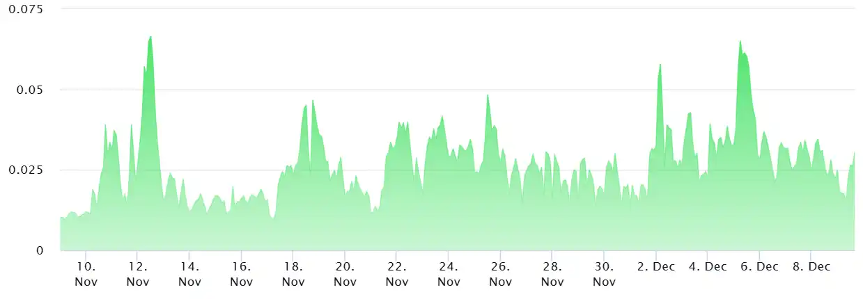 此外,永续合约融资利率目前为 2.7%,高于中性门槛的 2.1%,表明市场对短期杠杆的需求依然旺盛。然而,融资利率从 12 月 5 日的峰值 5.4% 逐步下降,这也可能反映出部分交易员对市场波动的警惕性增强。