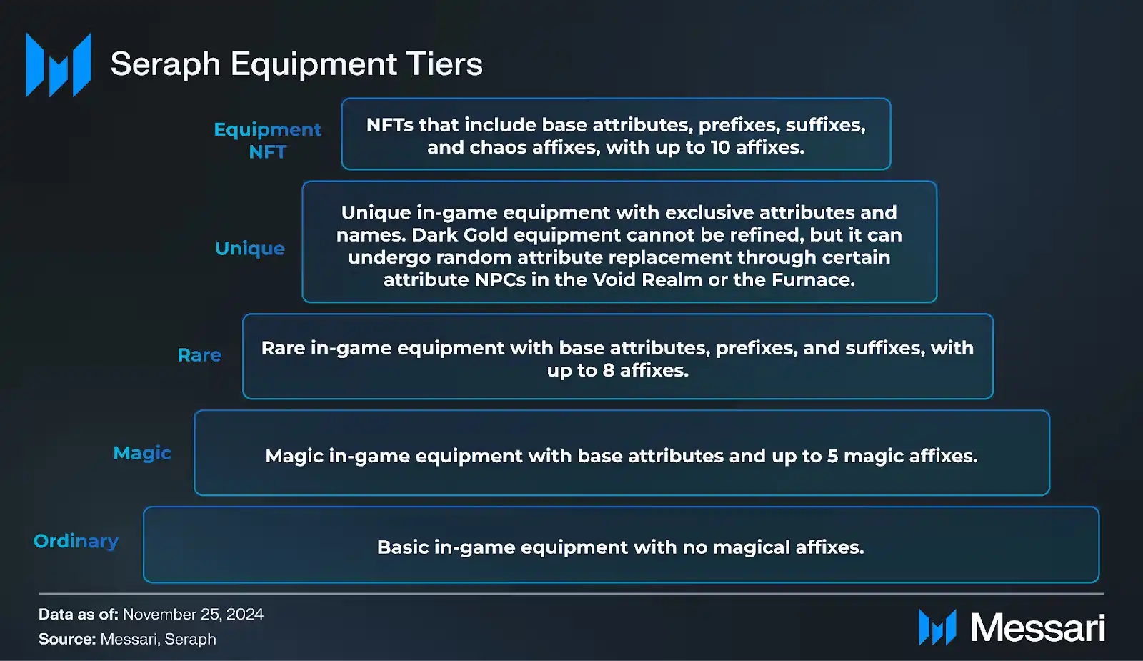 Seraph 提供了一个极为丰富的装备系统,玩家可从中获得收益。每位玩家可使用十个装备槽,分别为:左手武器、右手武器、项链、两个戒指、头盔、护甲、腰带、手套和鞋子。每件装备都属于以下等级之一: