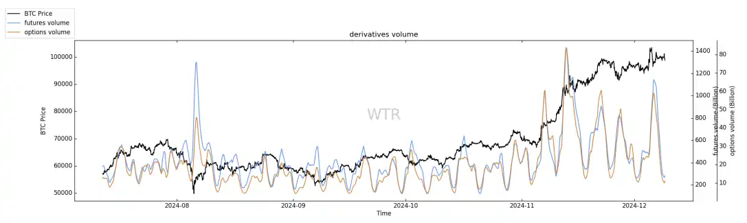 正如同上周提到⼀致,市场在衍⽣品成交量低位时迅速产⽣波动。本周衍⽣品成交量⼜回落⾄低位,表明⼜在酝酿下⼀次波动。