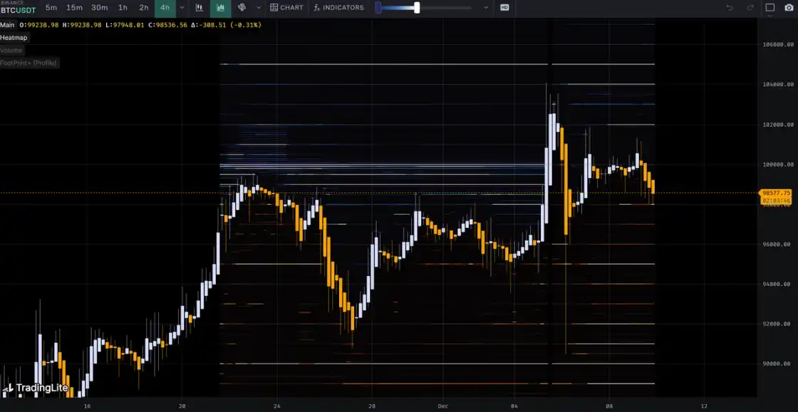 本周从 12⽉2⽇到 12⽉9⽇,冰糖橙最⾼附近$104088,最低接近$90500,震荡幅度达到 13% 左右。观察筹码分布图,在约 95000 附近有⼤量筹码成交,将有⼀定的⽀撑或压⼒。