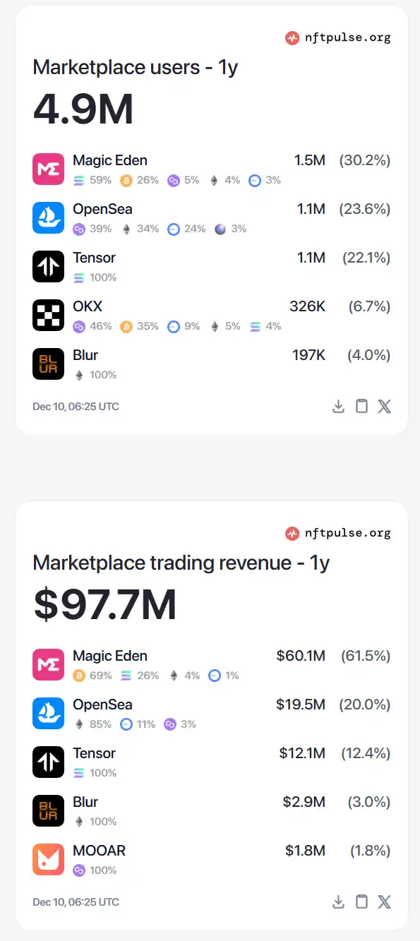 不过,从上面的用户数量与交易收入两个维度的统计数据看,Tensor 对 Magic Eden 其实都没有形成压倒性的领先。在 30 日期交易收入上,二者仅相差 15000 美元,可谓平分秋色。而在 1 年期交易收入上,Magic Eden 甚至还是要领先 Tensor 360 万美元的。