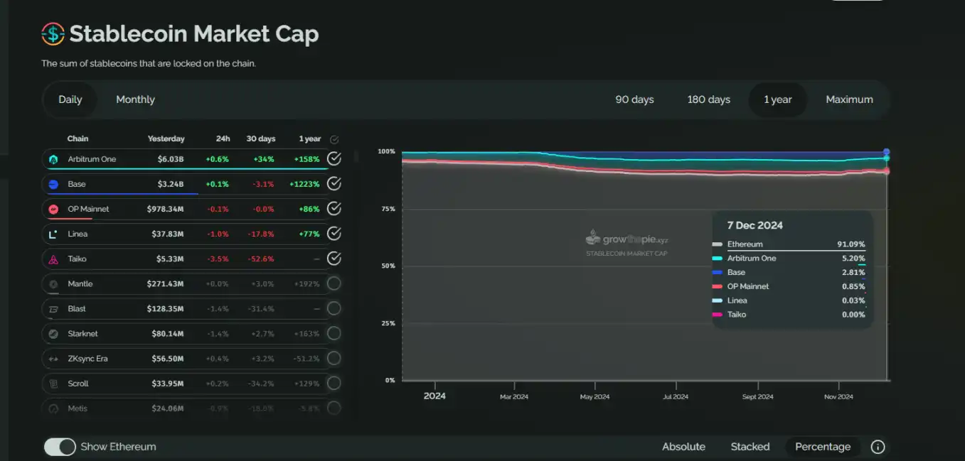 但在 TVL 方面,以太坊主网似乎仍是大户的第一选择。从链上锁定的稳定币总金额来看,以太坊主网在去年 12 月份的占比约为 95% 左右,目前占比略有下滑,但仍占到 91% 左右。而且 TVL 数据也几乎是以太坊主网在近一年来唯一明显上涨的数据。2023 年 12 月份,以太坊主网的 TVL 量约为 288 亿美元,截至 2024 年 12 月份,该数据上涨到 775 亿美元左右。增长幅度约为 2.69 倍,这一数据的增长率也超过了以太坊价格的增长率,这也与牛市下资产价格上涨有关。在 Layer2 当中,Arbitrum 和 Base 的稳定币 TVL 排名第二和第三。