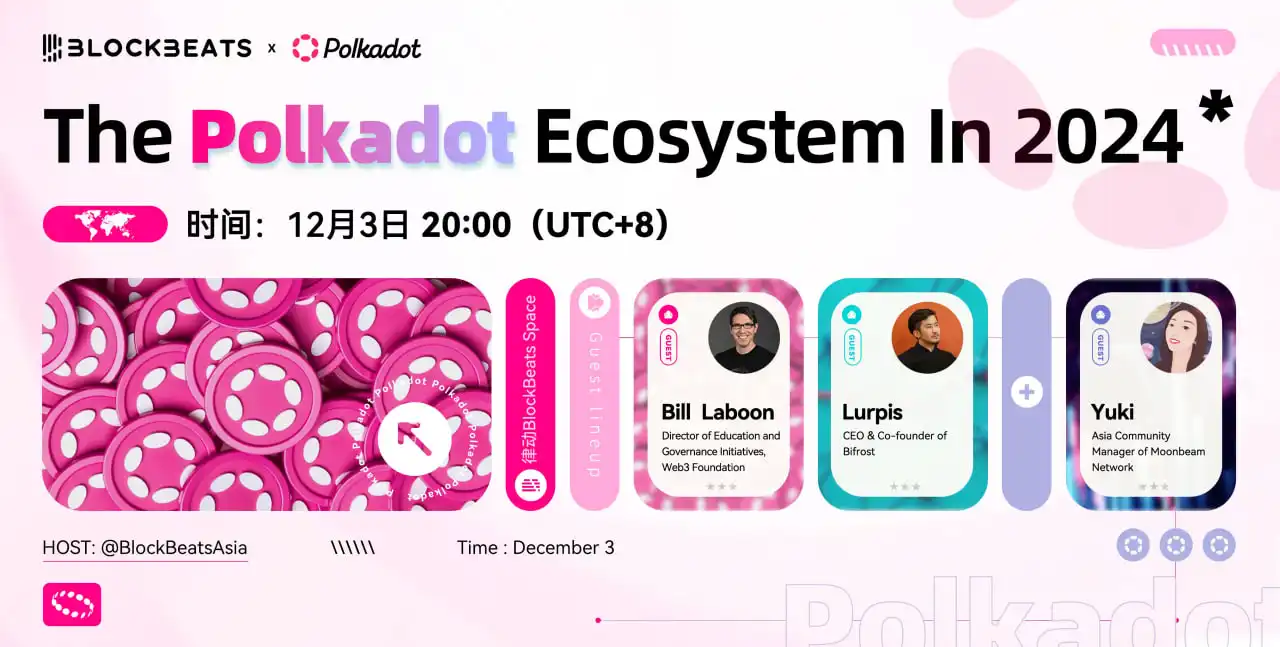 12 月 3 日,律动 BlockBeats 邀请到了波卡 Web3 Foundation 的 Bill Laboon、Bifrost 联创兼 CEO Lurpis 以及 Moonbeam Network 亚洲社区负责人 Yuki,以《The Polkadot Ecosystem In 2024》为主题,回顾一下 2024 年 Polkadot 生态有哪些发力。
