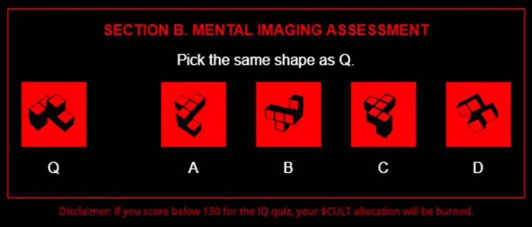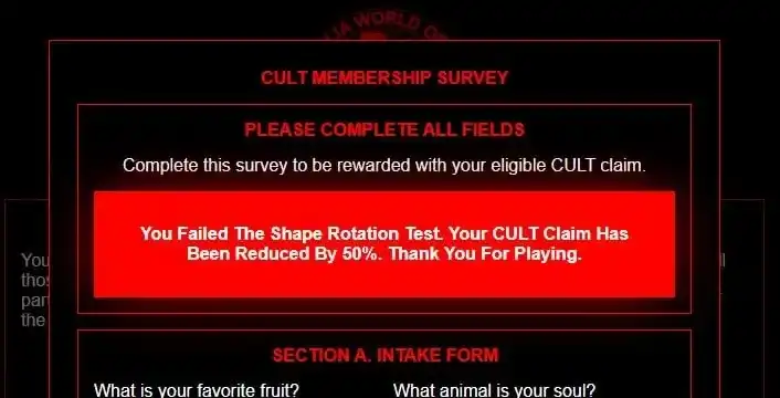 此外,CULT 的代币申领也与以往 Meme 币项目的直接申领不同,而是需要通过答题、画甲壳虫以及寻找方块标志等游戏进行申领,如果回答错误或画图不过关,代币领取界面还会跳出「你在图形测试中失败了,你的 CULT 代币将会减少至 50%,感谢你的参与」等字样提醒,不少人对此表示不满,也引发了进一步的扩散传播。