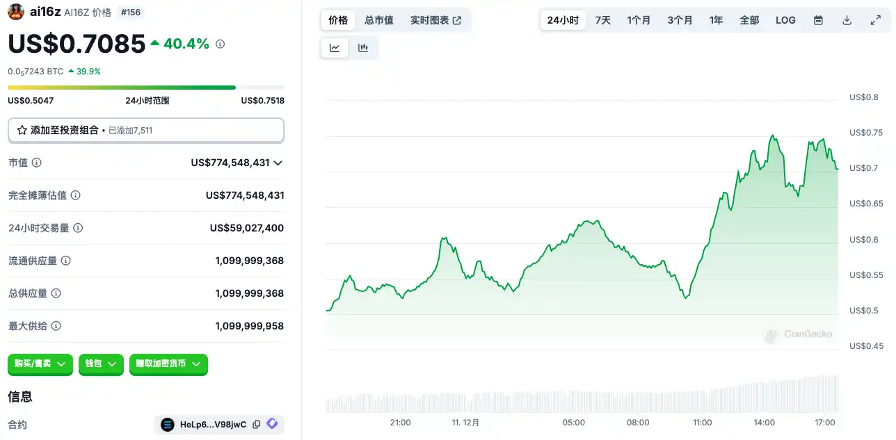 1.ai16z 市值突破 8 亿美元创历史新高,24 小时涨幅 52.4%