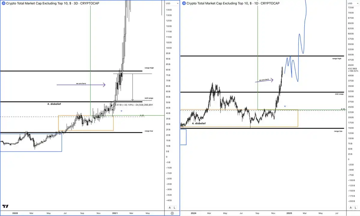 随着市场情绪高涨,投资者会变得更加贪婪,并开始追逐中小市值山寨币。我预计「其他」中市值山寨币将迎来新高。真正的山寨季仍在前方。