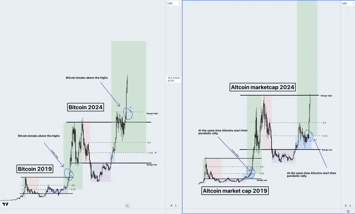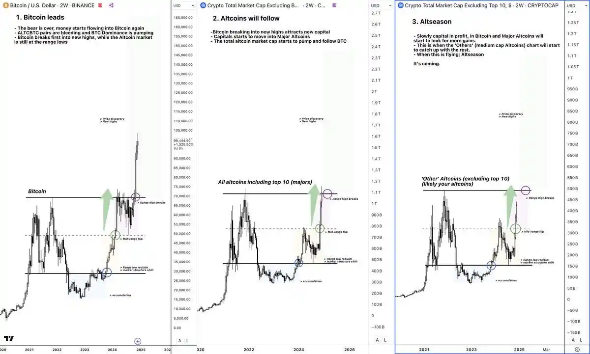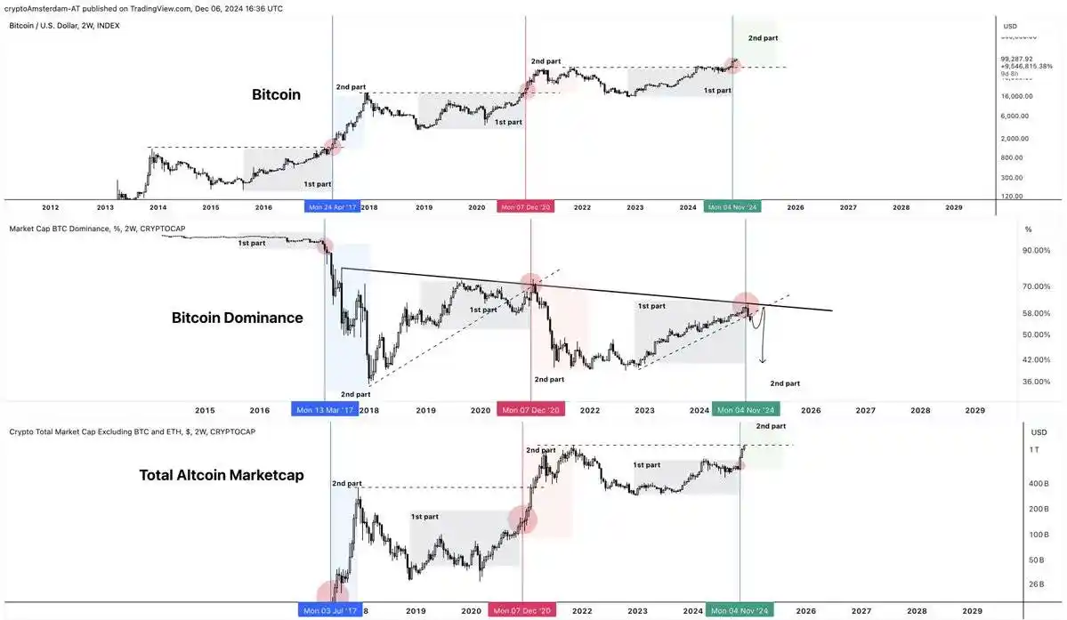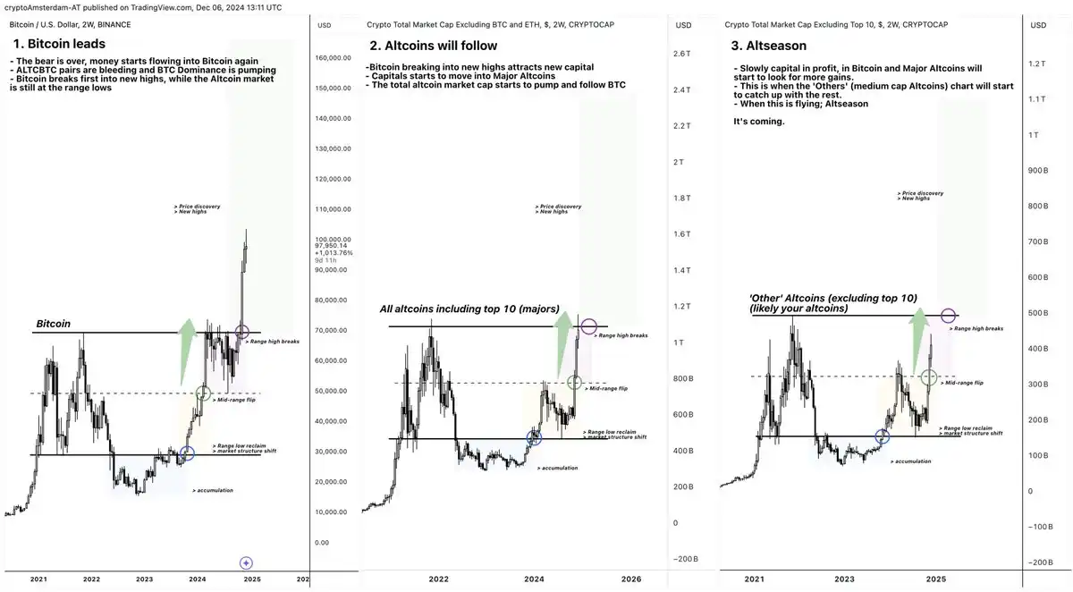 · 阶段 2:比特币突破历史新高,山寨币开始进入快速上涨阶段。