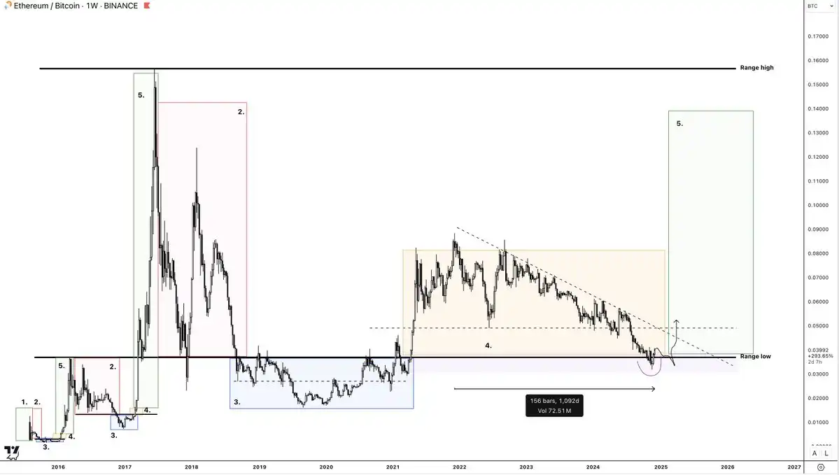 每个周期,以太坊在早期都会表现疲软(比特币上涨但仍低于前高),随后在比特币站稳前高上方时开始反弹。