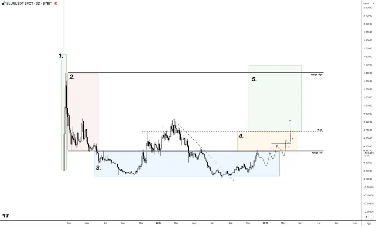 BLUR 是一个比较特殊的币种。今年早些时候,它未能守住阶段 4 的区间低位(即价格在低位区域的支撑失败),这可能是因为当时 NFT 市场整体低迷。
