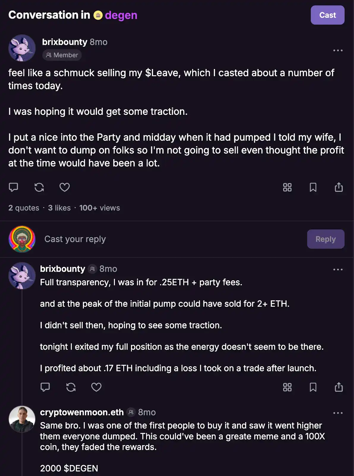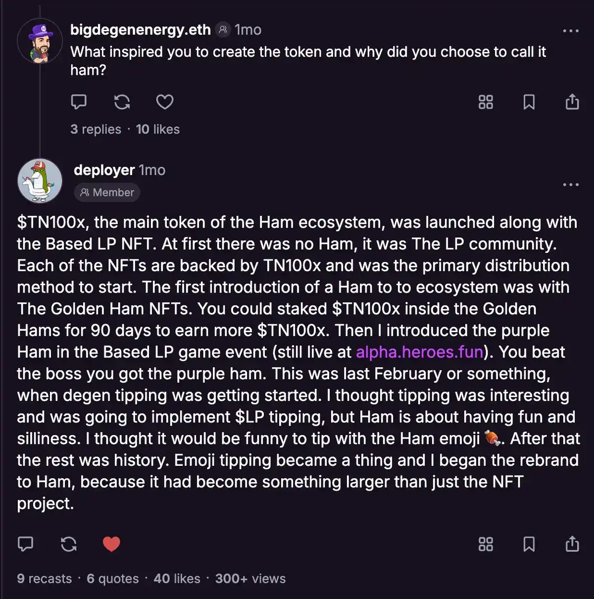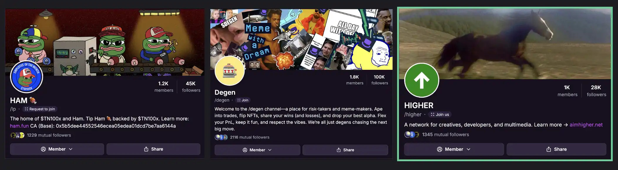因此,创意得到了充分释放,Farcaster 上代币化社区的初始时代诞生了,其中许多社区至今仍在蓬勃发展:HIGHER、TNX100 和 DEGEN。