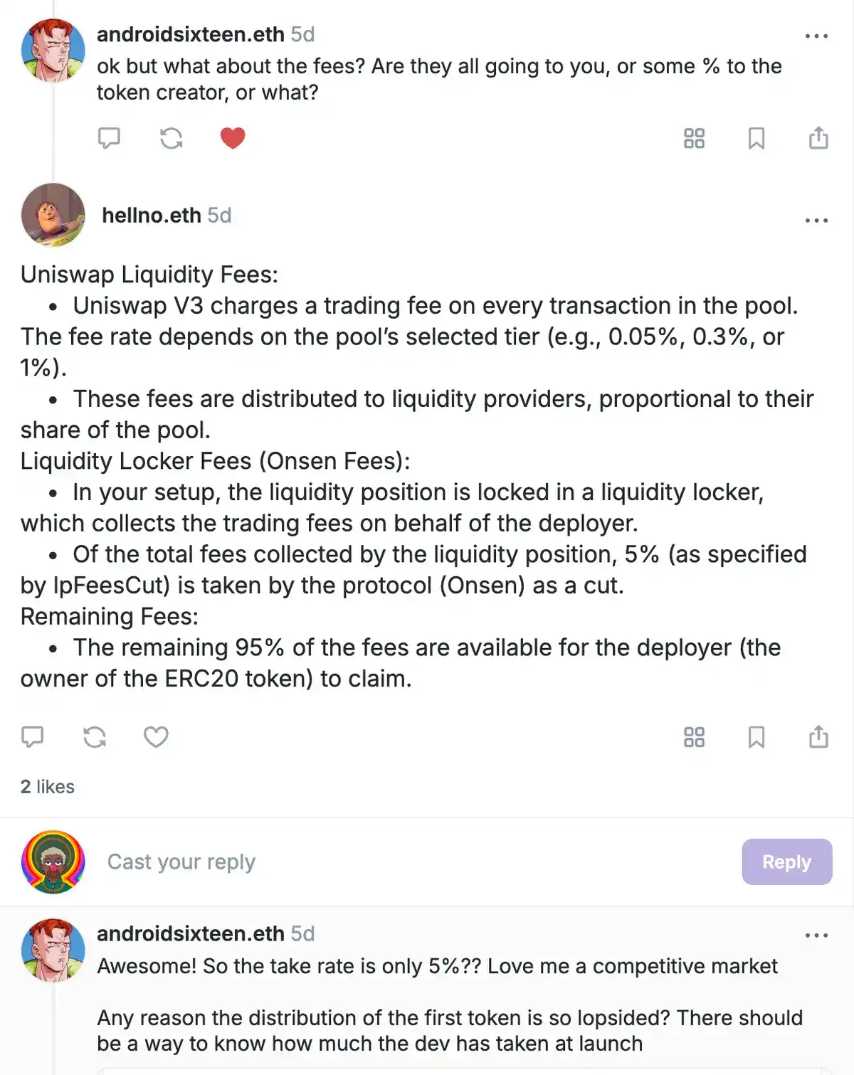 任何 Farcaster 用户都可以参与,只需上传一张图片并选择希望获得的分配比例(默认建议为 3%)。代币创建后,用户会收到包含详细信息的私信。只有当代币被购买后,dexscreener 才会显示相关信息。根据我的经验,创建者需要从零开始自筹流动性。Onsenbot 的费用设定较具竞争力,仅为 5%(相比之下,Clanker 的 1%Uniswap 费用中收取 75%)。