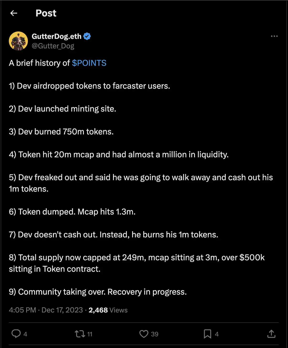 Farcaster 上的代币化的第一阶段始于 POINTS,由 iammatthias 在社区的轻微推动下作为一个玩笑推出,Six 写了一篇关于它的精彩帖子。