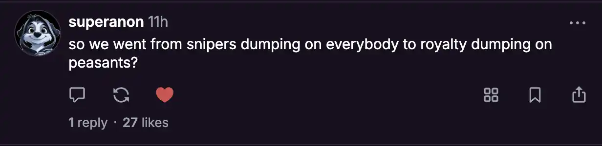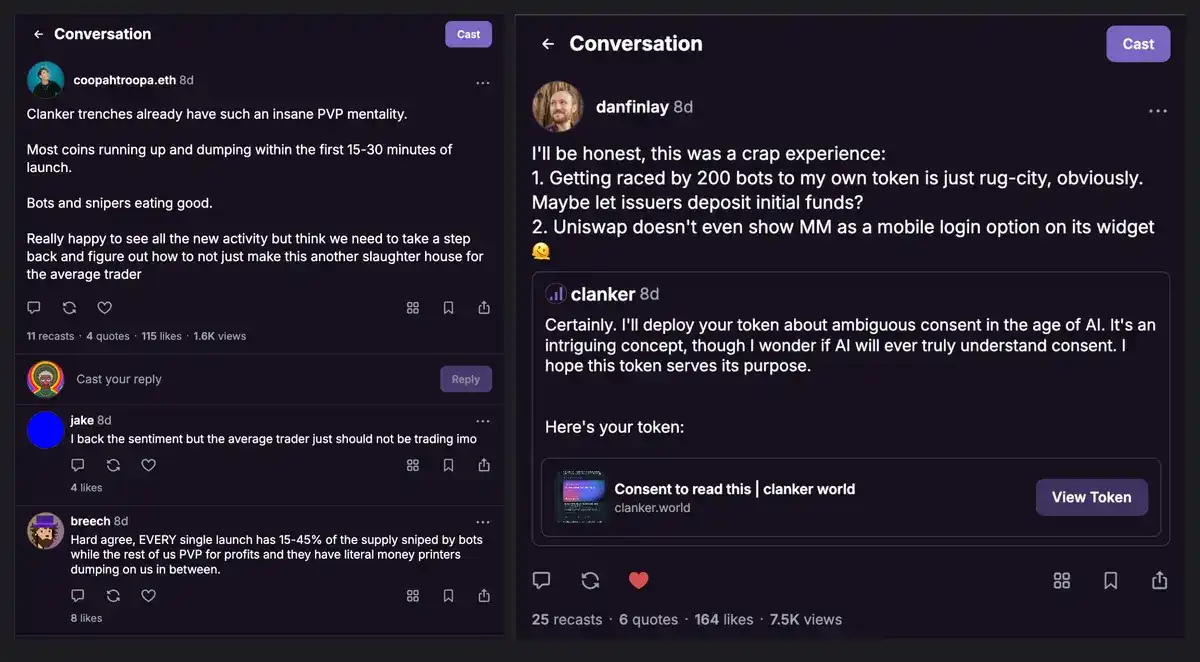 其中,Clanker 引发争议的主要问题在于,狙击机器人能够在代币发行之初以极快的速度购买代币,比大多数人(甚至包括其创建者)都要快,这些狙击机器人随后很可能会迅速抛售代币。
