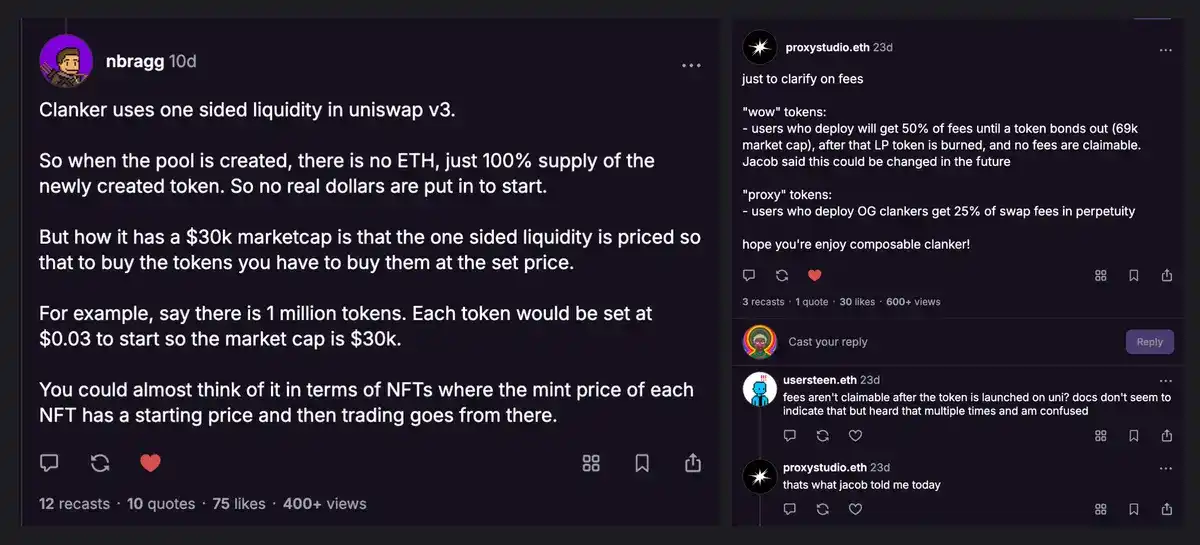 任何新代币或 meme 币发行的关键问题之一是确保用户能够购买和/或交易你的代币,从而有效地购买其未来的股份或利益。需要有足够的资产基础,以便能够顺畅高效地进行交易,Farcaster 上的成功代币化社区通过多种方式解决了这一问题。