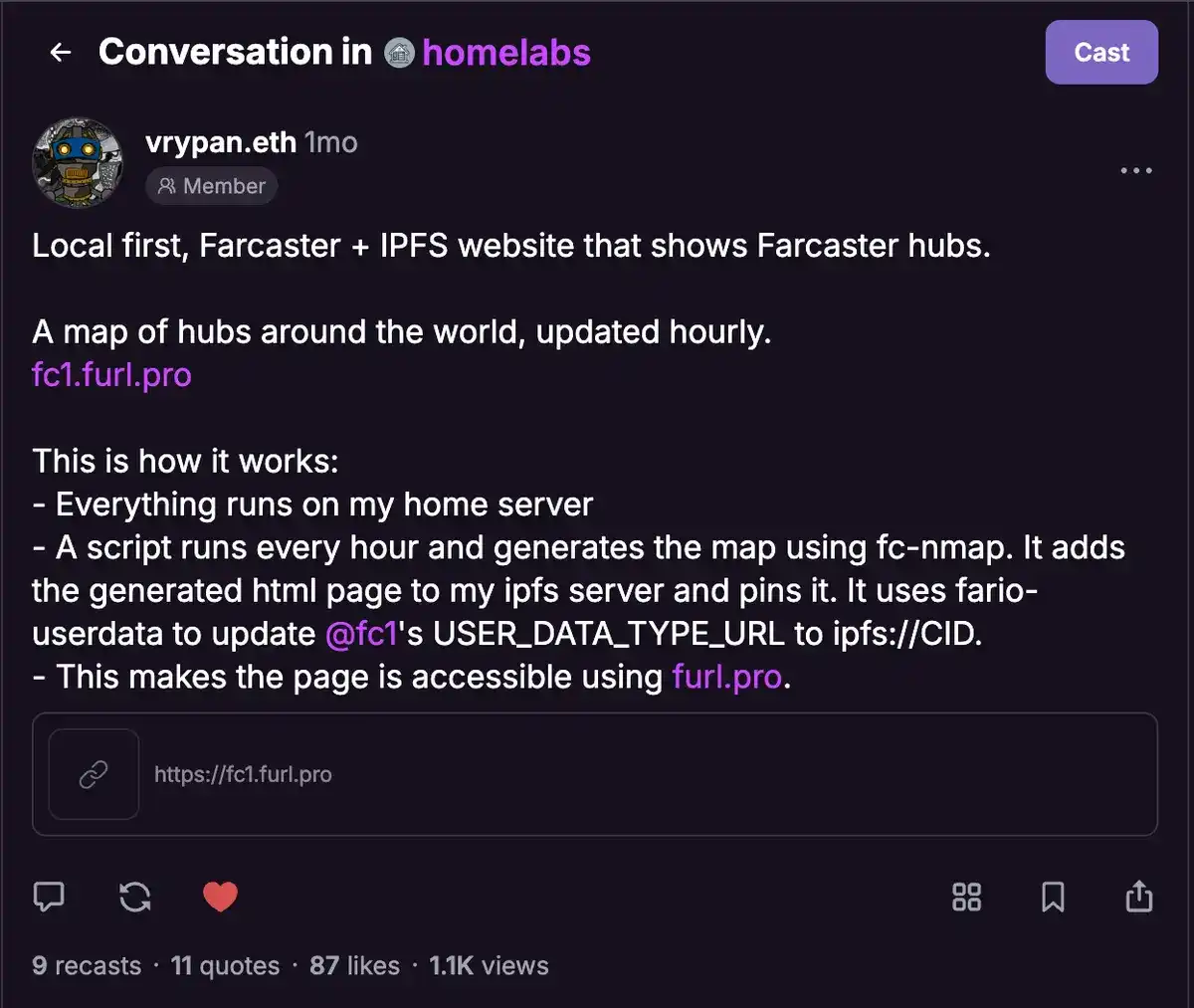 Farcaster 是一个建立在加密技术基础上的社交网络,从去中心化到有节点(中心),作为一个分布式的服务器网络,任何人都可以设置这些节点来存储和验证数据。