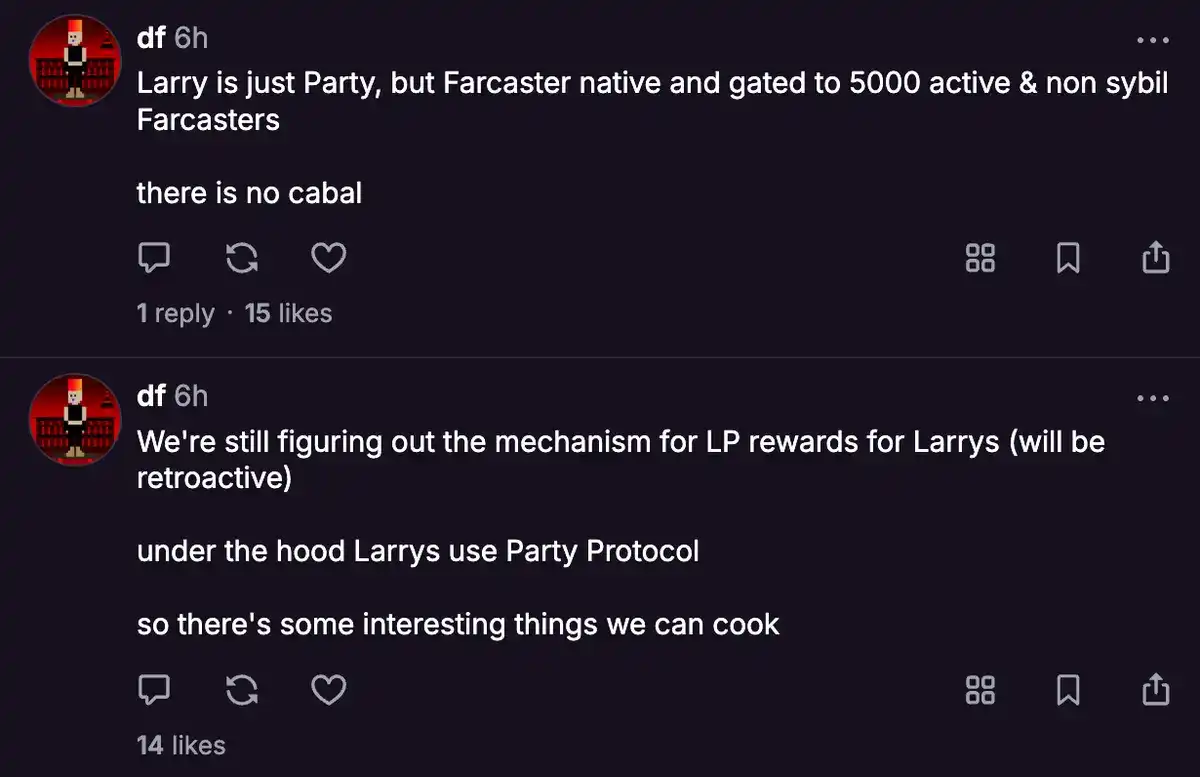 为了应对狙击行为,df 和 Stephancill 创建了 LarryBot,这是一种代币发行工具,允许所有人在上线前的 15 分钟(现已改为 69 分钟,毫无意外地符合 meme 文化)内以相同的价格购买代币。唯一的限制是,在这个时间窗口内,相关想法或 meme 必须吸引至少 3ETH(作为流动性注入),且参与者的 Neynar 评分需高于 0.9。