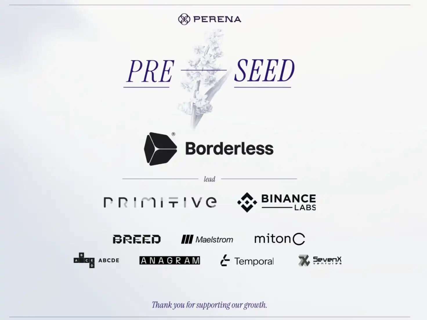 在融资方面,Perena 不仅获得了来自 Solana 联合创始人 Anatoly Yakovenko 和 Raj Gokal 等知名投资人的支持。还获得了众多机构的青睐,已完成 Pre-Seed 轮融资,Borderless 领投,投资方还包括 Binance Labs、Primitive Crypto、Anagram、Temporal、ABCDE Labs、SevenX Ventures 等,融资金额约为 300 万美元。此外,Perena 也与多家 DeFi 协议达成了合作。
