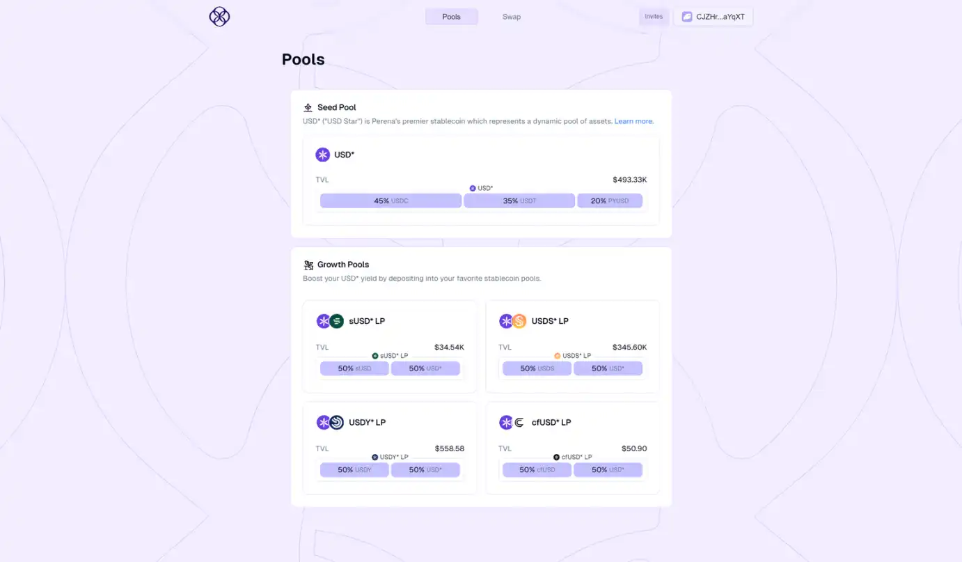 Perena 目前已经推出了其第一款产品——Numéraire。Numéraire 是一个多资产稳定币交换系统,其引入了 USD* 的概念。它采用 AMM 机制实现稳定币的无缝创建和交换,同时优化了各个市场的流动性和效率。解决了稳定币生态碎片化问题,并降低了新稳定币发行的资本要求。用户可通过该协议铸造稳定币、获取代币化真实世界资产收益,以及利用分层抵押债务头寸系统实现定制化的风险回报配置。不过,虽然 Numéraire 号称更便宜高效的稳定币交换,但或因流动性问题,目前磨损仍大于 Raydium 等平台。