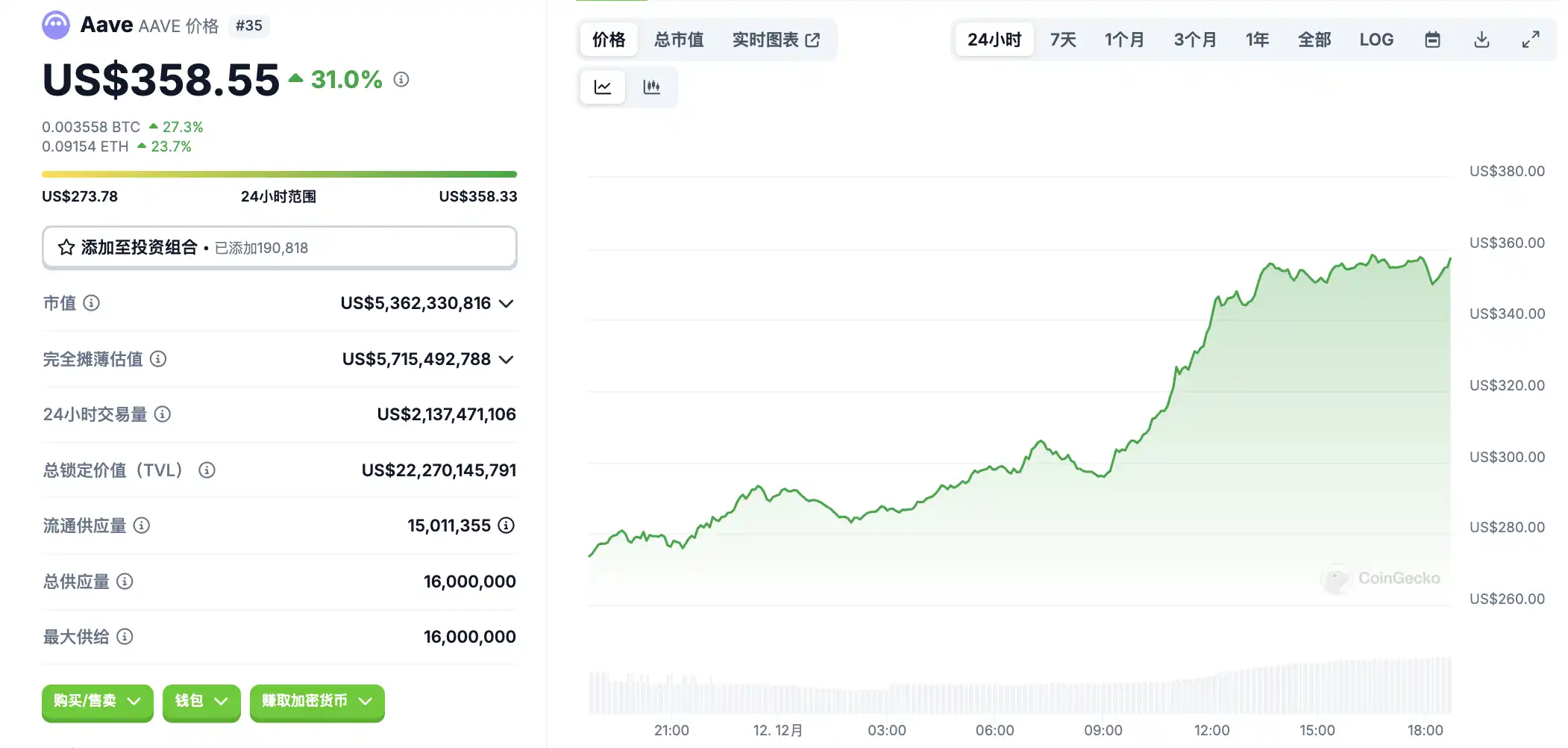 5.Aave 协议 TVL 已创下新高,但币价距离 ATH 仍有较大差距