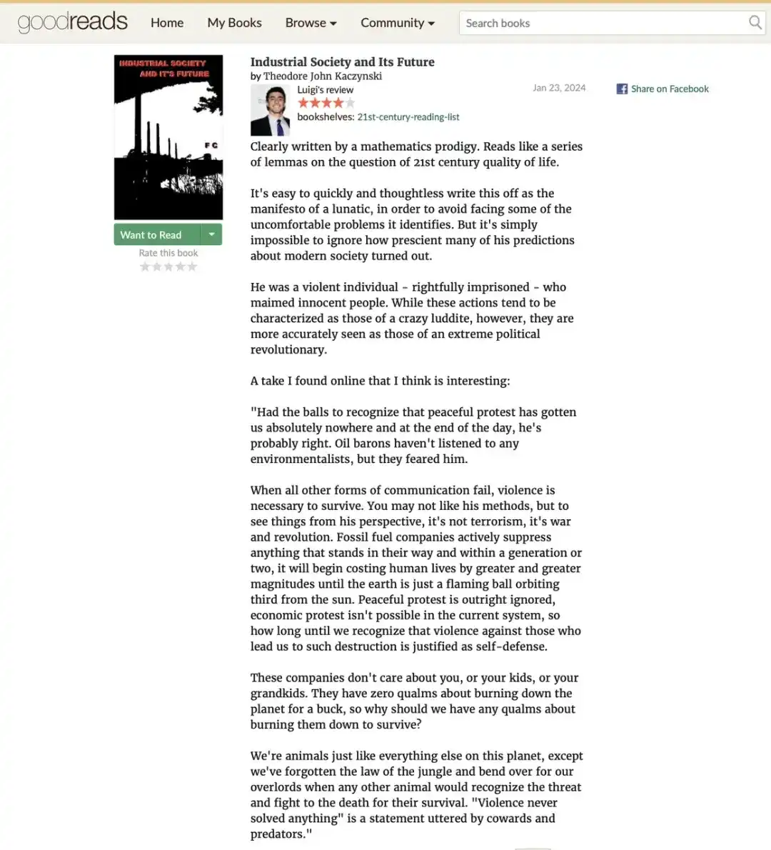 后来有人找到了他的 Goodreads 书单,知名投资人、数字游民倡导者 Tim Ferries 的《每周工作四小时》赫然在列,此外,他还曾于今年 1 月给极端分子、美国数学家、臭名昭著的「大学炸弹客」Ted Kaczynski 所著的《论工业社会及其未来》一书写过长评,他提到:「(我们)很容易快速而不假思索地将此视为疯子的宣言。但无法忽视他对现代社会的许多预测是多么的有先见之明……当所有其他形式的沟通失败时,暴力是生存的必要条件……这些公司不关心你、你的孩子或你的孙子孙女……『暴力永远不会解决任何事情』这是懦夫和掠夺者发表的声明。」值得一提的是,在被捕后,美国警方迅速封锁并隐藏了 Luigi 所有的社交媒体(但其 X 平台账号 @PepMangione 或因久未发文,得以幸免),其 Goodreads 书评也不例外。