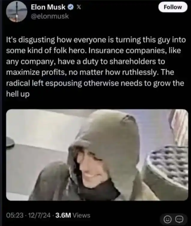 此外,有网友截图显示马斯克曾于 12 月 7 日对此事发表了自己的看法:「太恶心了,每个人都在把那家伙塑造成某类民间英雄。保险公司就像任何公司一样,有责任最大限度地为股东需要增加利润,不管手段有多无情。不吃这一套的激进左翼还欠长大成熟。」但该推文目前并未在马斯克账号内容下找到,疑似已遭删除或为 P 图恶搞。