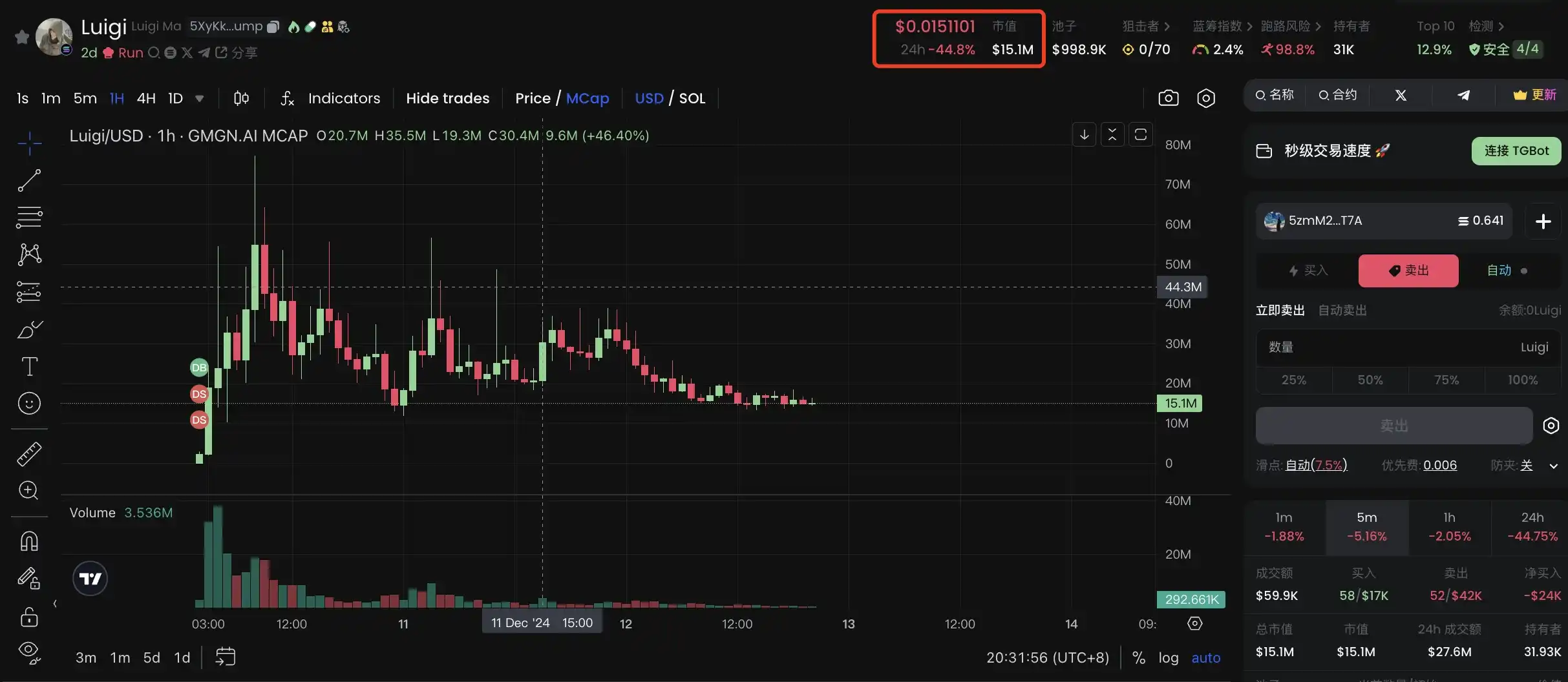 据 GMGN 数据显示,截至撰稿时,此次事件主人公同名代币 LUIGI 目前价格暂报 0.015 美元,市值约为 1500 万美元,距离高点的 7800 万美元市值已经跌去 80% 左右。