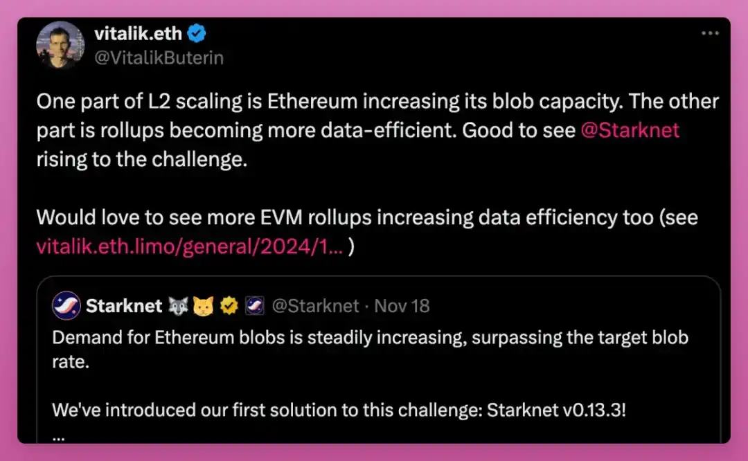 他们还推出了 v0.13.3 更新,通过更智能的区块压缩,将 blob gas 成本降低了 80%。随着以太坊 blob 使用量的增加,Starknet 可以维持较低的费用。展望未来,Starknet 计划进行更多效率升级,甚至 Vitalik 也不吝于称赞。