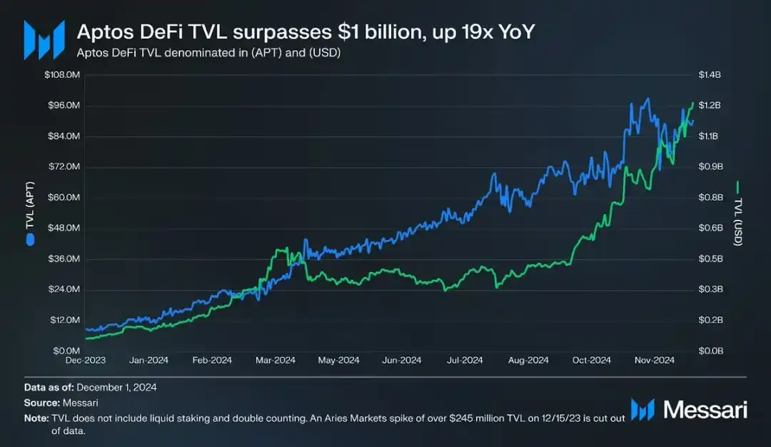 Aptos 是继 Sui 之后 TVL 和 DeFi 领域增长最快的 MOVE 语言区块链,其 TVL 首次超过 10 亿美元,同比增长 19 倍。