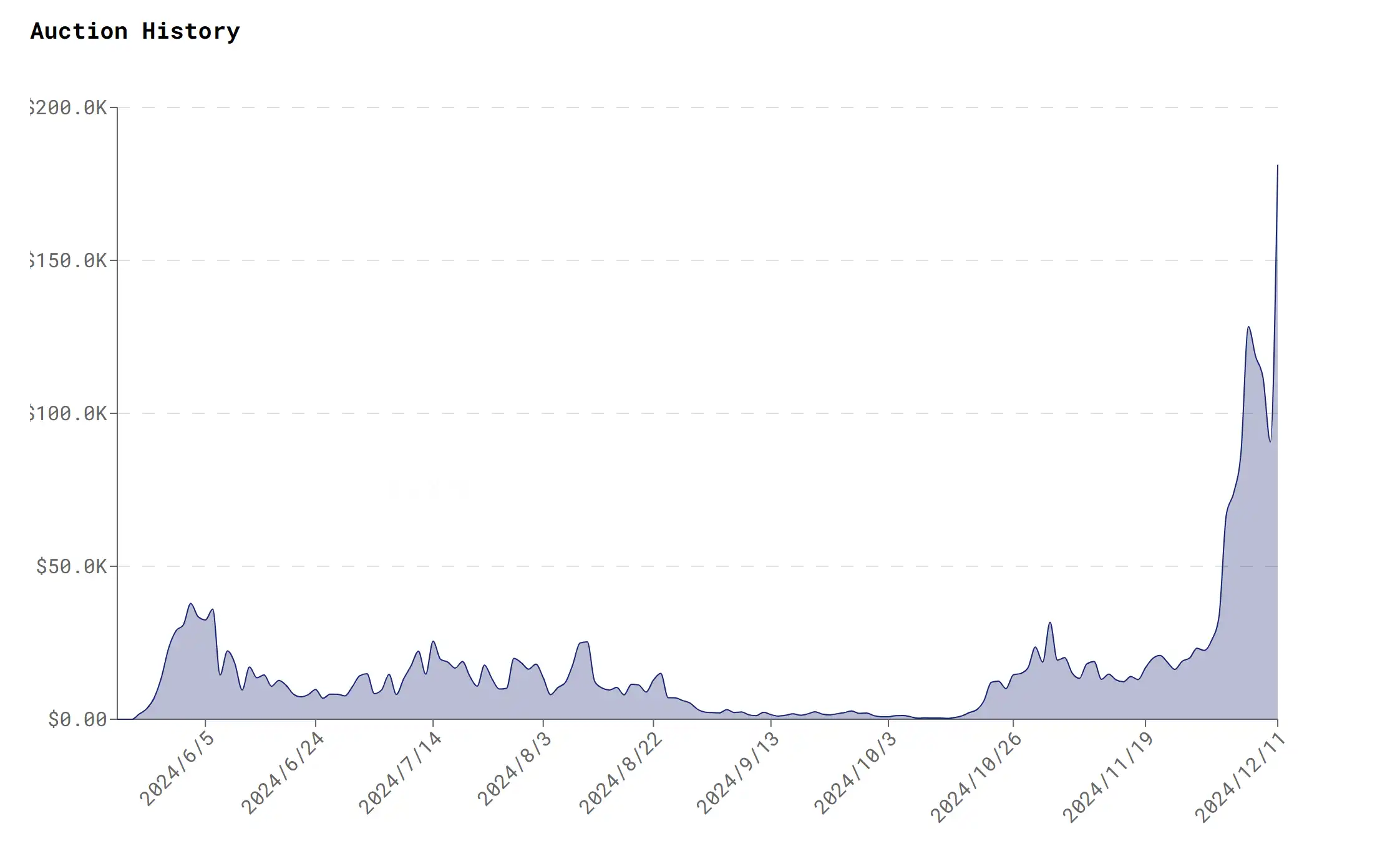Hyperliquid 在 tge 并完成「史诗级」空投后,拍卖价格不断突破新高。早在今年 6 月份左右其拍卖天花板在一直在 3.5 万美金左右徘徊,未能打破此前 3.5 万美金的硬顶。然而在 TGE 之后,Hyperliquid 受到的市场关注空前,这次直接「推背」到 12.8 万美金,一举突破之前的桎梏。在 12 月 11 日又以 18 万美金的 FARM 拍卖实现了历史新高。