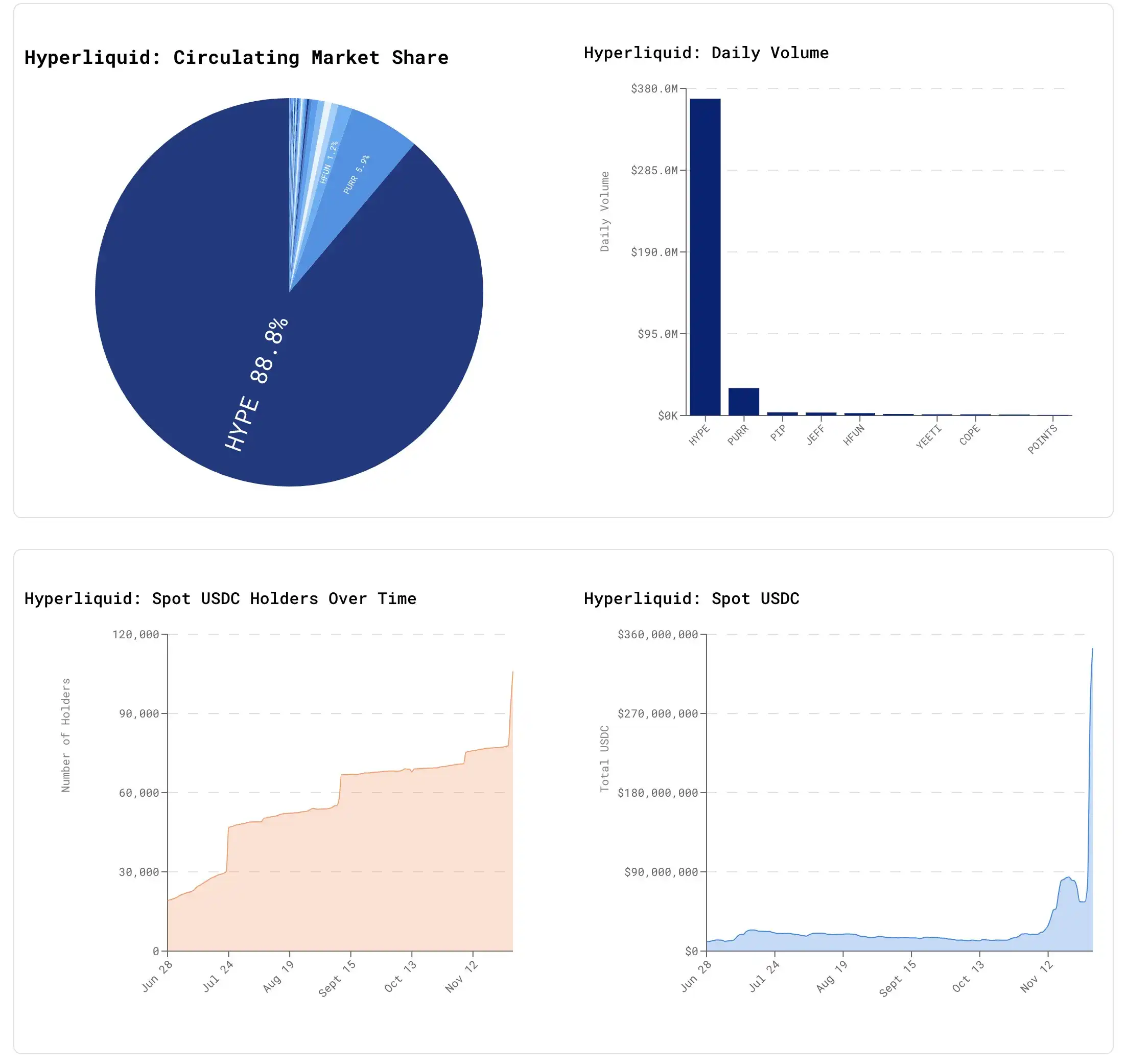 同时,Hyperliquid 的拍卖通常每 31 小时进行一次,满打满算全年最多有 282 的现货上架,这种被动「限额」的方式也从侧面提高了上线项目的质量。