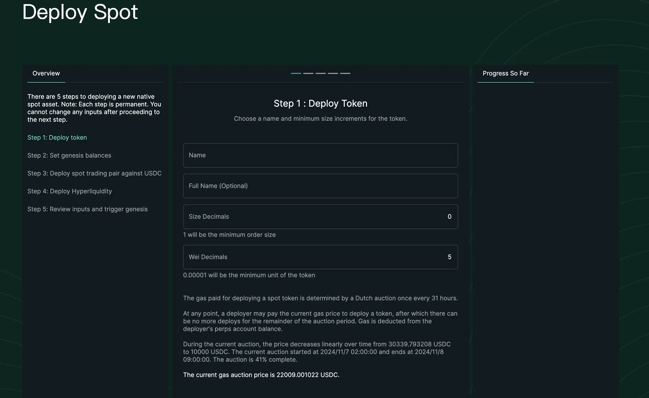 首先项目方如果要上线现货,需要申请获得 HIP-1 原生代币的部署权限(HIP-1 是 Hyperliquid 制定的代币标准),随后会采用荷式拍卖的机制来决定最终的代币 ticker 会花落谁家。荷式拍卖也称做降价拍卖,拍卖的起始价格会以高于市场预期的价格开始,随后不断降价并在首个接受该价格的情况下成交。从博弈论的角度上来讲荷兰式拍卖反应了报价人真实的心理预期,可以以公允的价格实现拍卖。