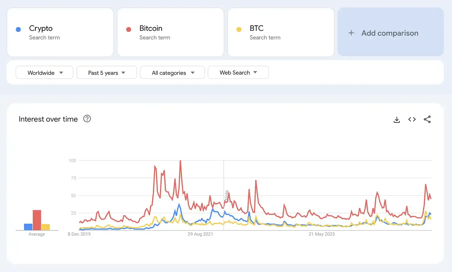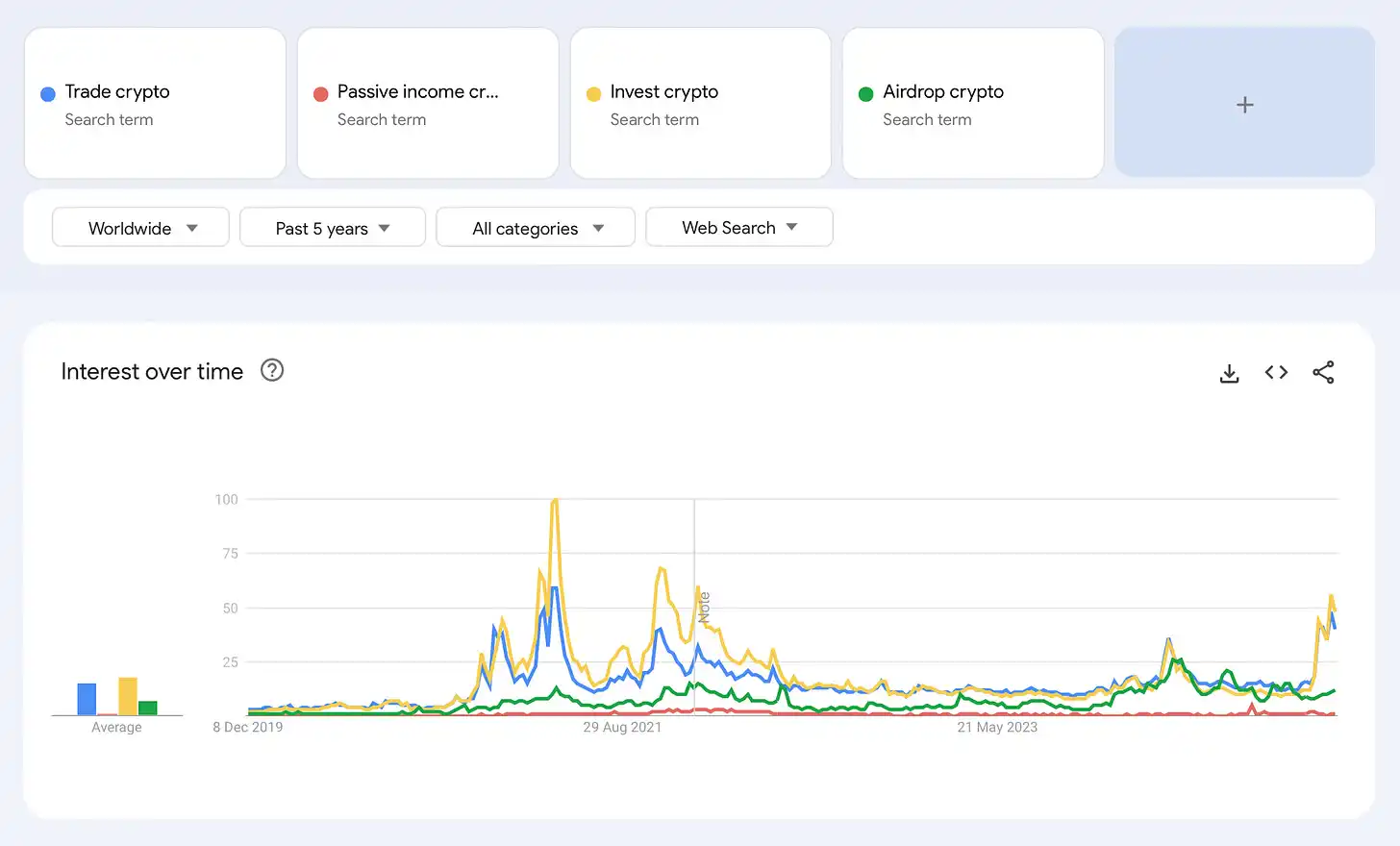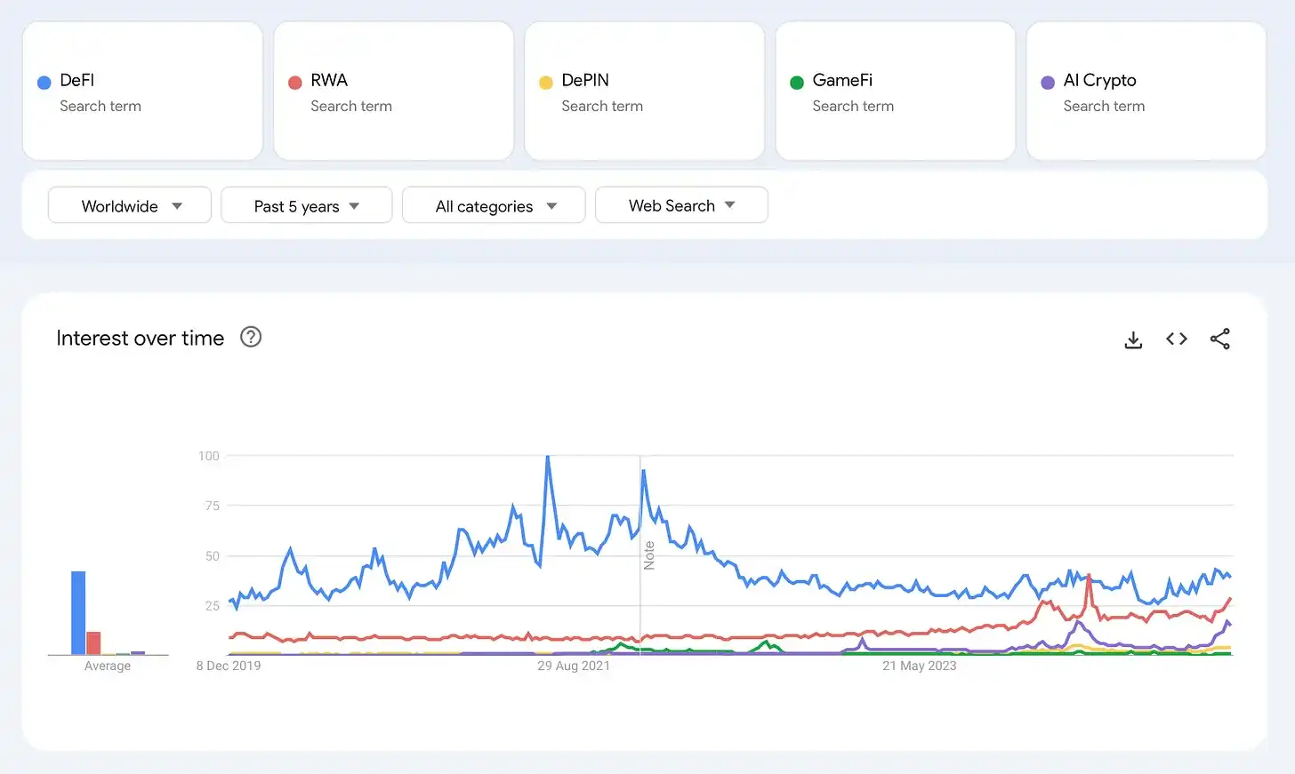 为了更好地理解用户兴趣的变化,我分析了过去五年的 Google Trends。这一时期覆盖了牛市和熊市市场周期,提供了一个客观视角。