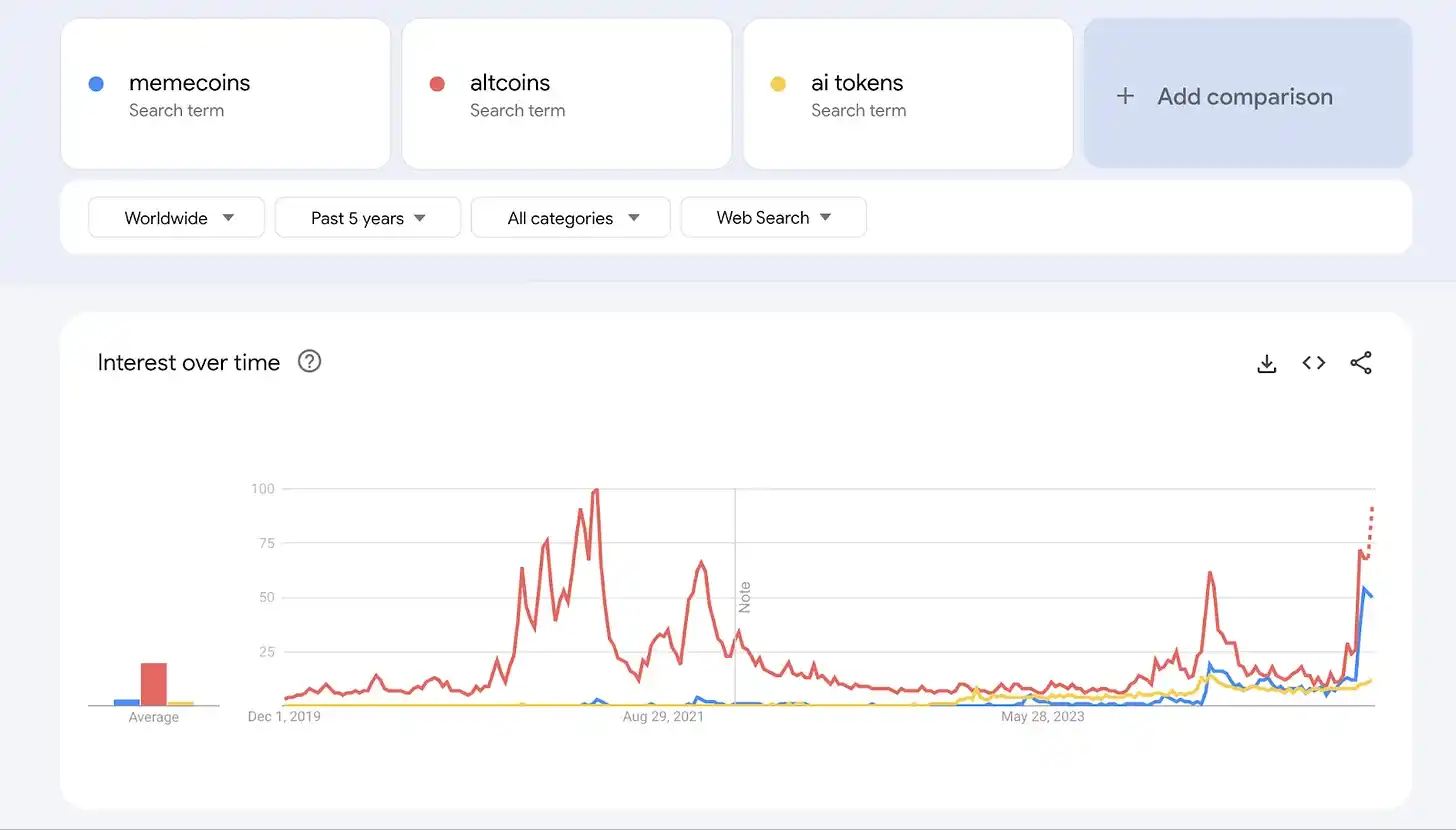 所有其他品牌的搜索,包括在 Crypto Twitter 上经常讨论的品牌,如 Vitruals、Ethena 或任何一个 L2 链,都远远落后于上述品牌。