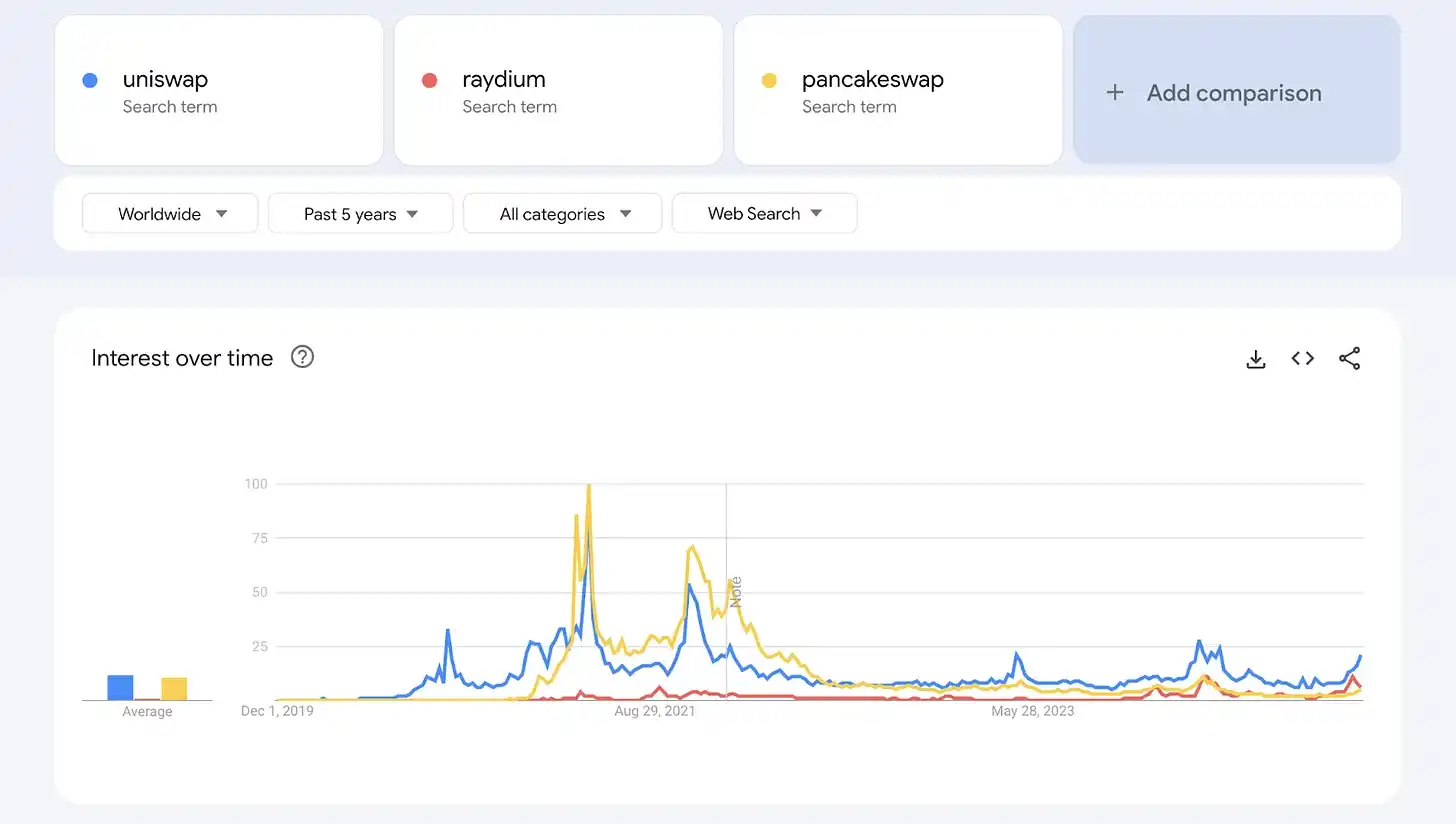 · 在 TVL 领先的 DEXs 中,PancakeSwap 在 2021 年 5 月的搜索热度中占据主导地位。2024 年 12 月,Uniswap 居领先地位,其次是 Raydium。