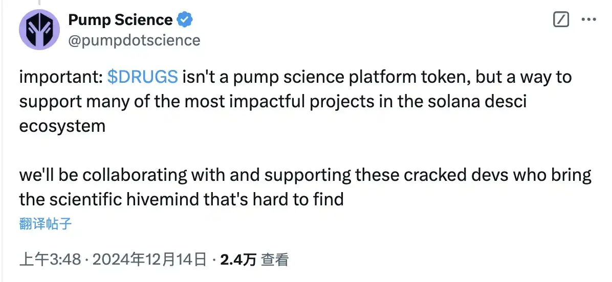该项目之所以广受关注,在很大原因上是因为头部 DeSci 项目 Pump Science(RIF、URO)的明牌支持,不过 Pump Science 也已强调 DRUGS 不是 Pump Science 平台代币。