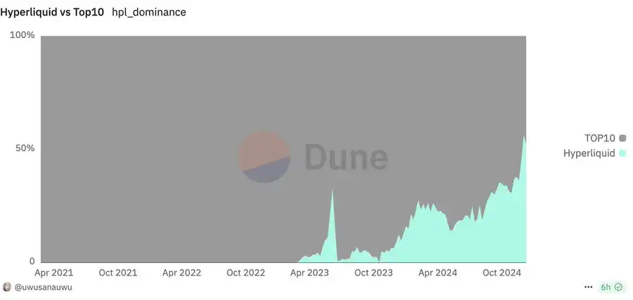 Hyperliquid 在永续去中心化交易平台领域占据主导地位,过去一个月的交易量占比超过 50%。