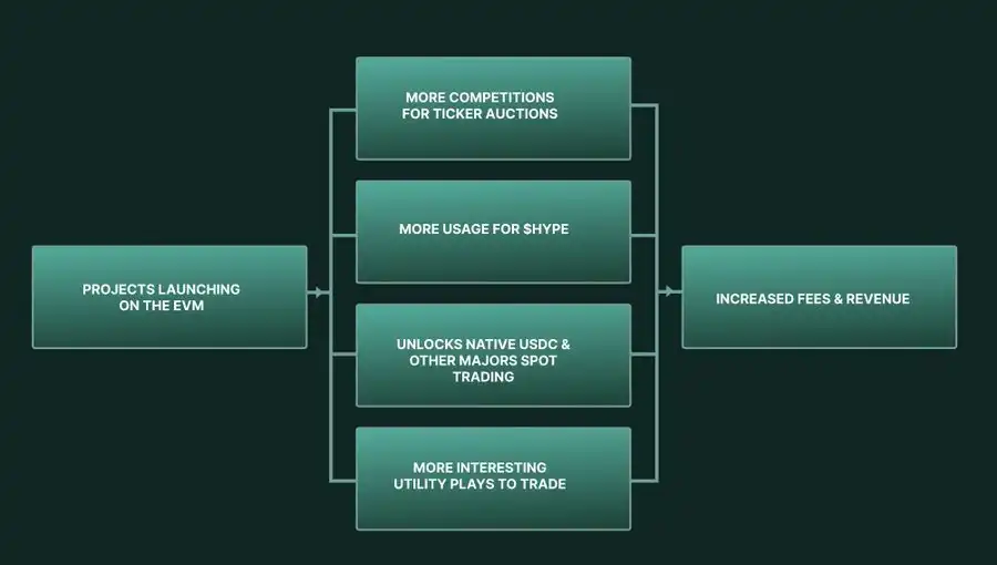 此外,EVM 将让 Hyperliquid 在更多人心中成为一个「正式的」L1 网络,并为其生态系统吸引更多关注。这可能释放当前在场外观望的资本进入市场。