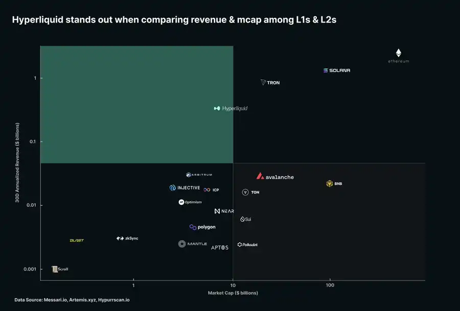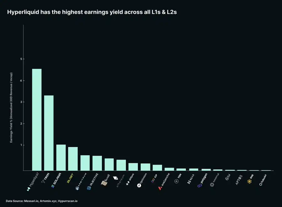 目前,只有 3 个一级区块链(L1)收入超过 Hyperliquid:以太坊、Solana 和 Tron,它们的市值要高得多。实际上,Hyperliquid 的收益率(年化收入/流通市值)远远领先,是所有 L1 和 L2 平台中最高的。