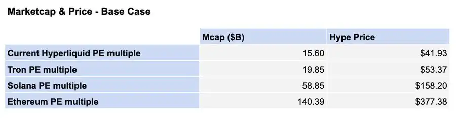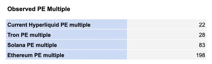 话虽如此,考虑到其他一级链(L1)和二级链(L2)的市盈率,当前 Hyperliquid 的市盈率可能偏低。一个「合理」的情景可能是:
