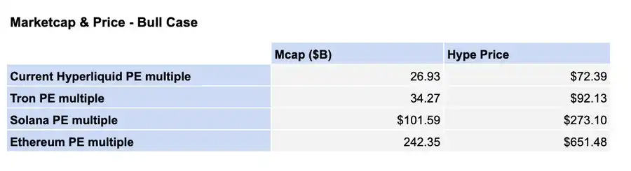在这些条件下,我们可以看到 HYPE 的价格区间从 41.93 美元(基础情景,最低倍数)到 651.48 美元(牛市情景,最高倍数)。